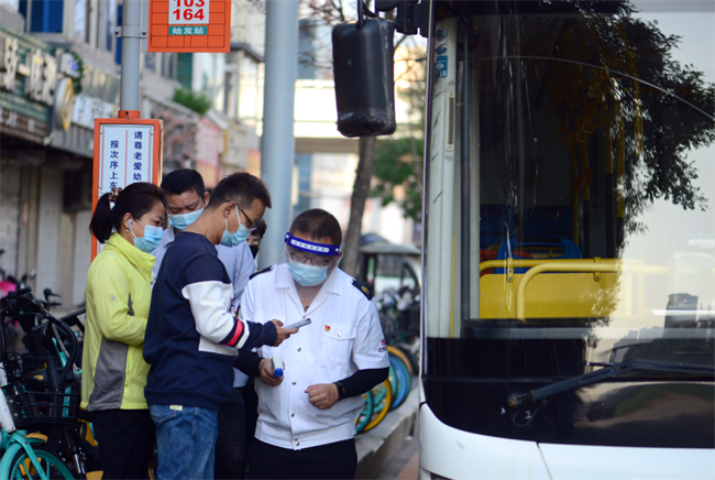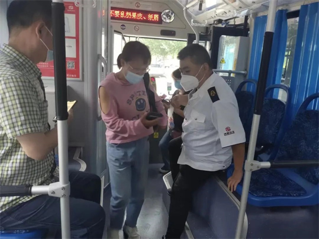 在長(zhǎng)客西站264路、103路始發(fā)站,副隊(duì)長(zhǎng)程玉磊配合公交駕駛員對(duì)乘客的健康碼、72小時(shí)核酸陰性證明、規(guī)范佩戴口罩、測(cè)量體溫等工作進(jìn)行檢查,廣大乘客主動(dòng)配合。