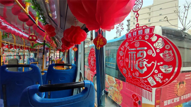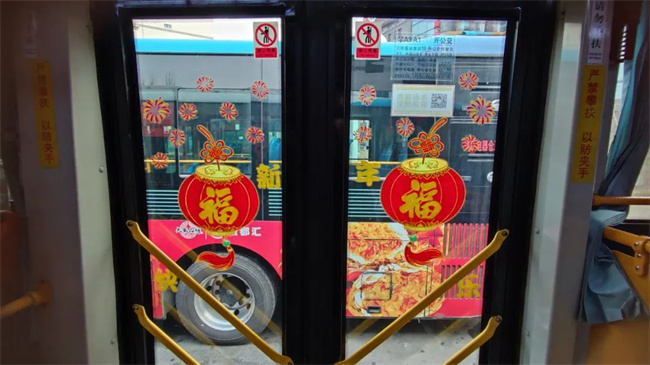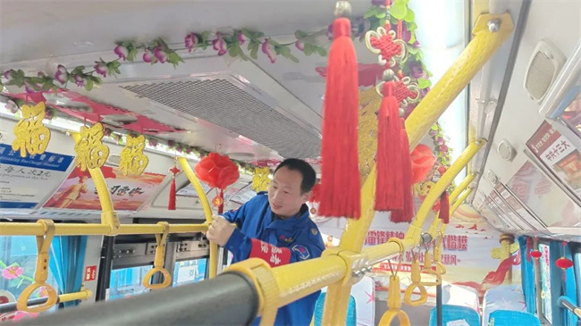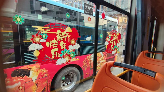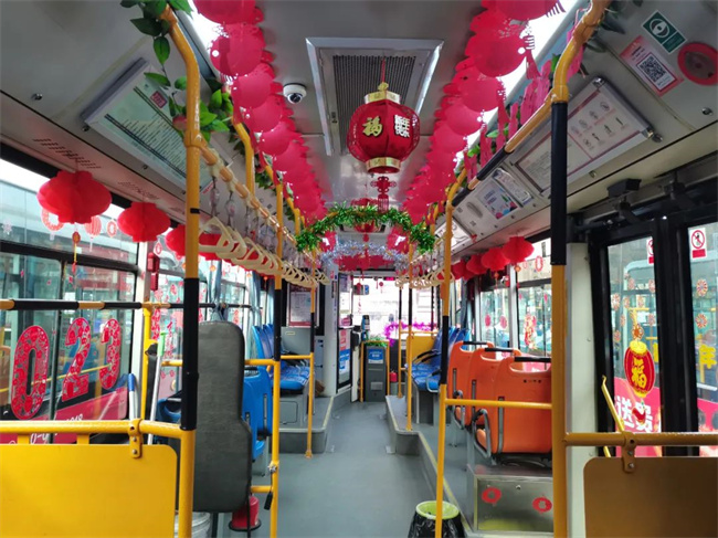 在辭舊迎新之際,通運(yùn)公司249路駕駛員王眾自費(fèi)購買了小燈籠,拉花,窗花,福字等飾品來扮靚自己的愛車。被精心“打扮”后的車廂,年味十足。