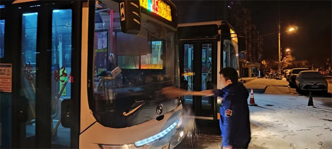 車隊(duì)管理人員、駕駛員提前到崗,清掃積雪,清潔車輛,保證公交車輛首班車準(zhǔn)點(diǎn)發(fā)出。
