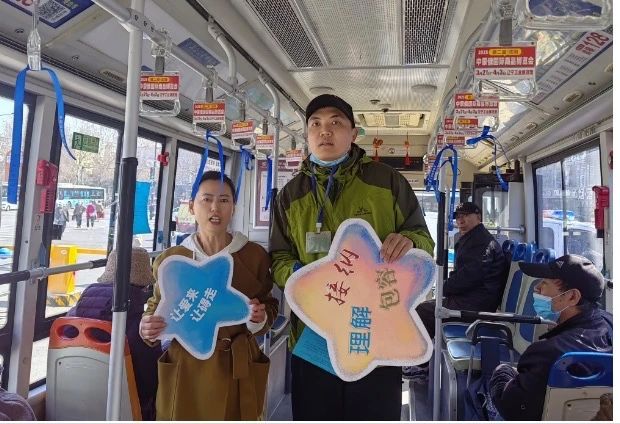 活動中,志愿者們精心布置公交車廂,懸掛象征關(guān)愛的藍(lán)色絲帶,通過車廂內(nèi)“孤獨癥兒童乘車行為習(xí)慣”主題宣講,向市民普及“多一份等待、少一次催促”的包容理念。