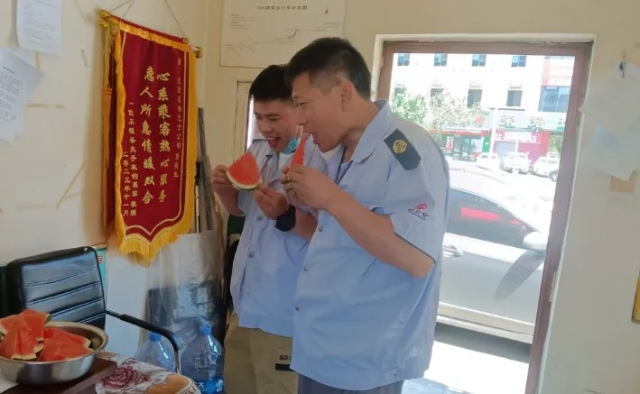 在這個(gè)酷熱的夏天里,車隊(duì)為駕駛員們精心準(zhǔn)備了清涼解渴的西瓜和消暑佳品綠豆粥,讓駕駛員們?cè)诙虝旱男菹r(shí)間里,得以迅速緩解燥熱與疲憊,恢復(fù)元?dú)猓U鲜忻癜踩孢m出行。