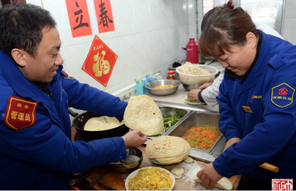 車隊齊隊長告訴記者,去年冬運開始后,沈陽各條公交線路終點站食堂為一線職工提供免費早午餐,保證駕駛員吃飽喝足再開工?!巴?,早餐做花卷、雞蛋、粥等早點,午餐是兩素一葷,保證駕駛員營養(yǎng)充足?!饼R隊長說,初七當(dāng)天是節(jié)后第一個工作日,2條線路60名駕駛員全部到崗。當(dāng)天恰逢“立春”,立春是二十四節(jié)氣之首,是民間最為重視的一個節(jié)氣,這一天素有吃春餅、鞭春牛等習(xí)俗。車隊條件簡單,但為了讓大家伙感受春的氣息,讓司機一起“咬春”,車隊工作人員初六那天就采購好卷餅菜所需的食材,當(dāng)天一大早就來到站房和面、烙餅。記者注意到,吃完春餅,齊隊長還給每人發(fā)了一個“平安果”,寓意新的一年平平安安。