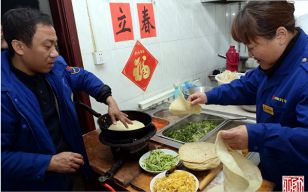 “哎呦,今天烙春餅啦!難怪老遠(yuǎn)兒就聞見了香味兒??欤o我先來兩張!”2月3日大年初七,是節(jié)后的第一個工作日,恰逢立春。11時左右,211路駕駛員張智剛跑完一圈兒回到大北門終點站,就被食堂的飯香吸引過去。