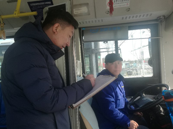 線路人員提前半小時到崗,在各始發(fā)站區(qū)及時清除公交站點積雪,車隊長、站長與駕駛員們一起清掃車門、車窗冰雪,維持乘客秩序。駕駛員提前發(fā)動車輛熱車,保證車廂溫度,讓乘客在雪天踏上溫暖的車廂。