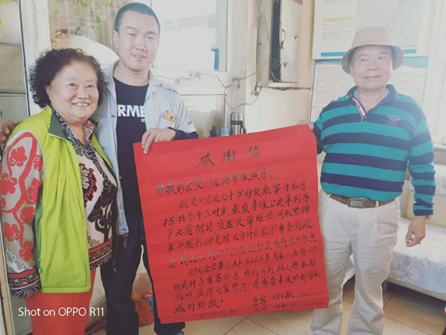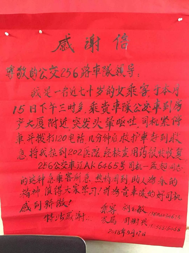 兩天后,老人攜同老伴,將一封寫滿真情的感謝信送到了通利公司256車隊。老人說:“當天舊疾復發(fā),非常危急,萬幸救護及時才沒有釀成悲劇。”據(jù)悉,在經(jīng)過短暫治療后,老人不顧阻攔,堅持要親自來到公交車隊對孟超同志表達感謝,并請求車隊領導對孟超這種救死扶傷的高尚品德提出鼓勵與表揚。老人在站務室等待了近兩個小時,才將這份真誠的謝意親自交到了駕駛員孟超的手上。